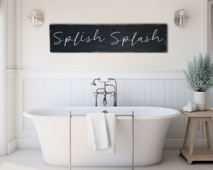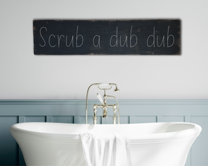 Large antique style wooden Scrub a dub dub bathroom sign.