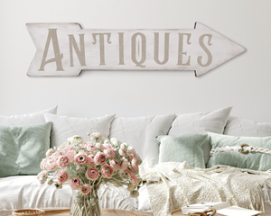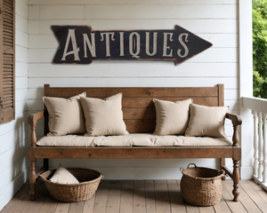 Large wooden arrow shaped Antiques sign. White & Tan 45"