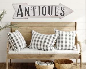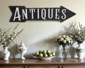 Large wooden arrow shaped Antiques sign. Black & White 45"