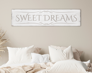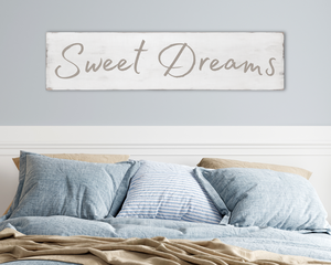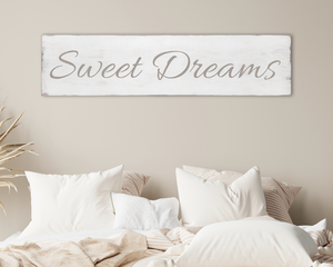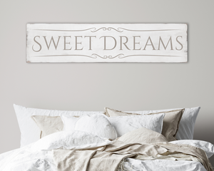 Large antique style Sweet Dreams wood sign. Off-white and tan.