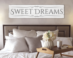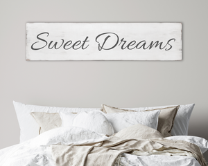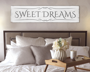 Large antique style Sweet Dreams wood sign. Off-white and black.