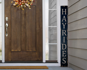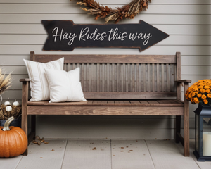 Large antique style wooden arrow shaped Hay Rides sign. Black...