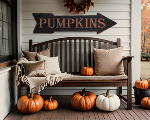 Antique style Pumpkins wooden porch leaner sign with arrows.