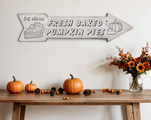 Large antique style wooden arrow shaped Pumpkin Pies sign. Wh...