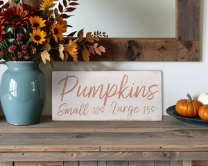 Pumpkins - small 10 cents, large 15 cents. Rustic fall wood s...