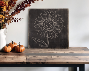 Sunflower line art hand painted on reclaimed wood. Black & Ta...