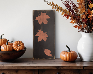 Falling maple leaves reclaimed wood sign hand painted. Vertic...