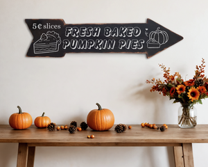 Large antique style wooden arrow shaped Pumpkin Pies sign. Bl...