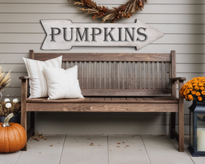 Large antique style wooden arrow shaped pumpkins sign. White ...