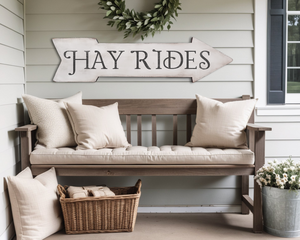 Large antique style wooden arrow shaped Hay Rides sign. White...