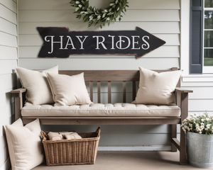 Large antique style wooden arrow shaped Hay Rides sign. Black...