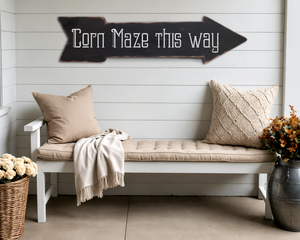 Large antique style wooden arrow shaped Corn Maze sign. Black...