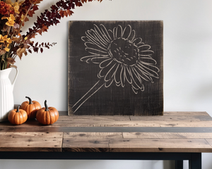 Rustic minimalist hand painted line art daisy wood sign. Blac...