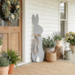 Large porch leaner sitting gray rabbit with a burlap bow.