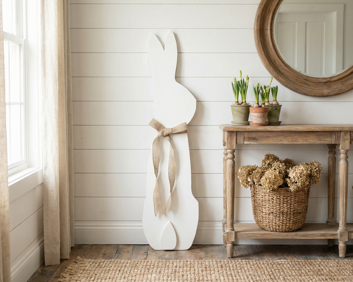 Welcome a touch of seasonal charm to your home with this handcrafted wooden rabbit porch leaner. Made from solid wood, this minimalist design is perfect for those who appreciate simple elegance. Whether placed outdoors on a covered porch or indoors in your entryway, this rabbit adds a cozy vibe to any space. A burlap bow tied around the neck completes the look, lending a delightful touch of texture and warmth. Sturdy and built to last, this rabbit leaner makes a lovely statement piece that celebrates the beauty of understated decor while seamlessly blending into your home’s style.