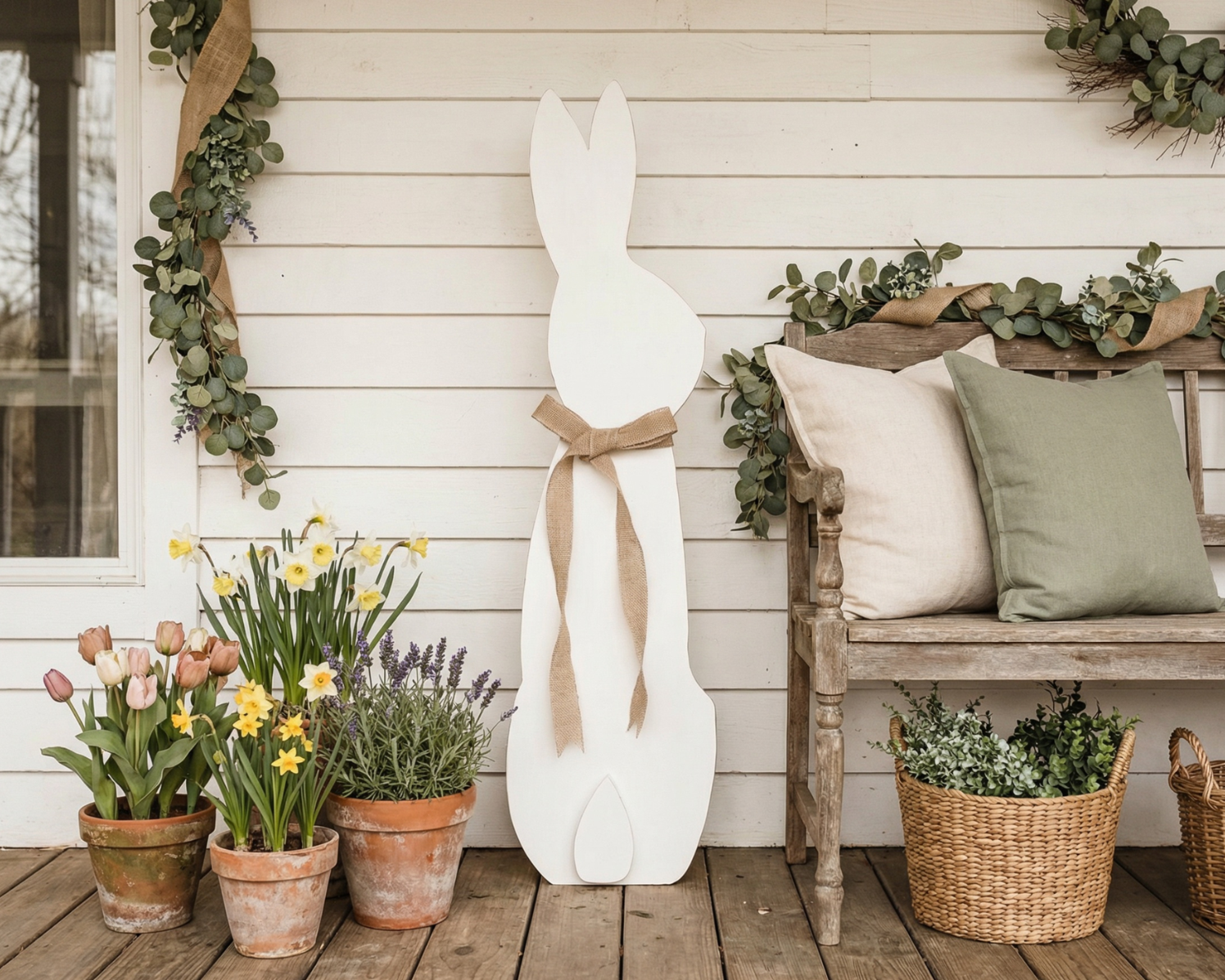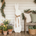 Large porch leaner sitting white rabbit with a burlap bow.