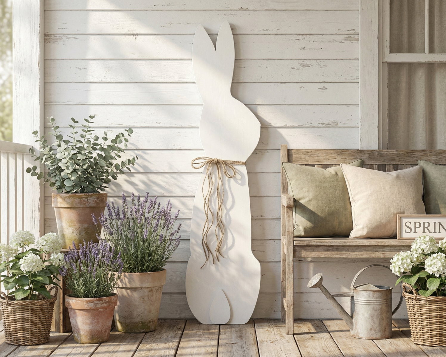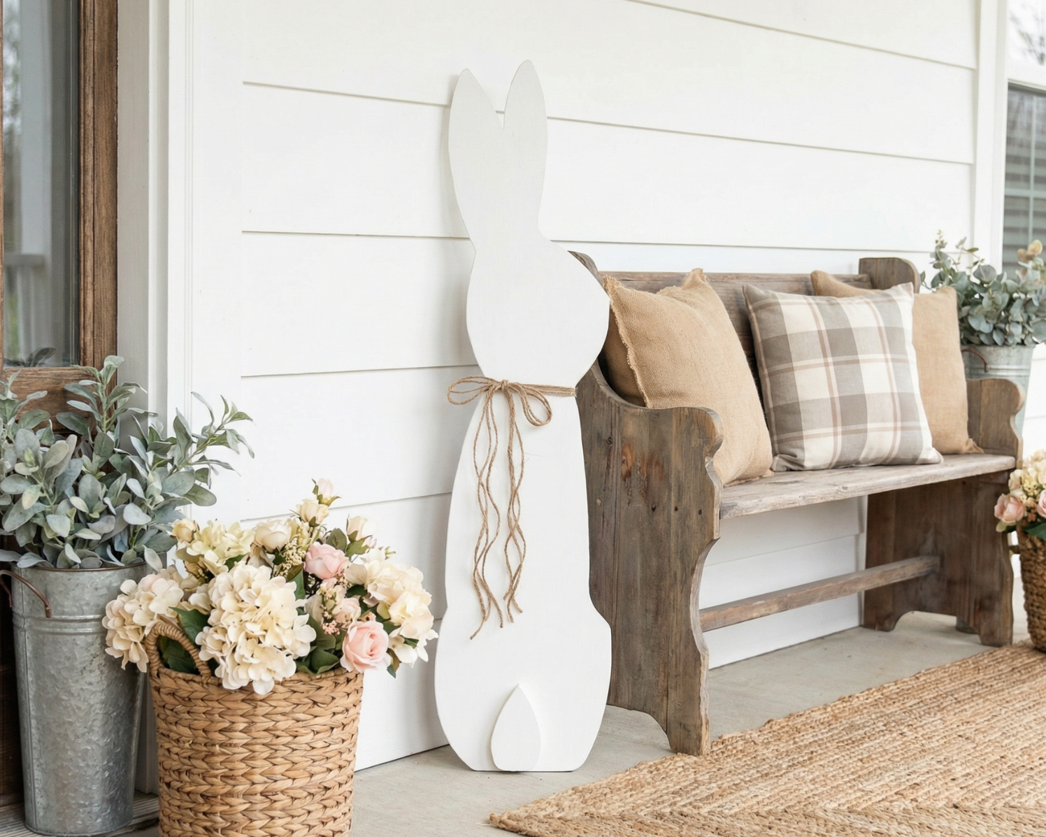 Large porch leaner sitting white rabbit with a jute twine bow.