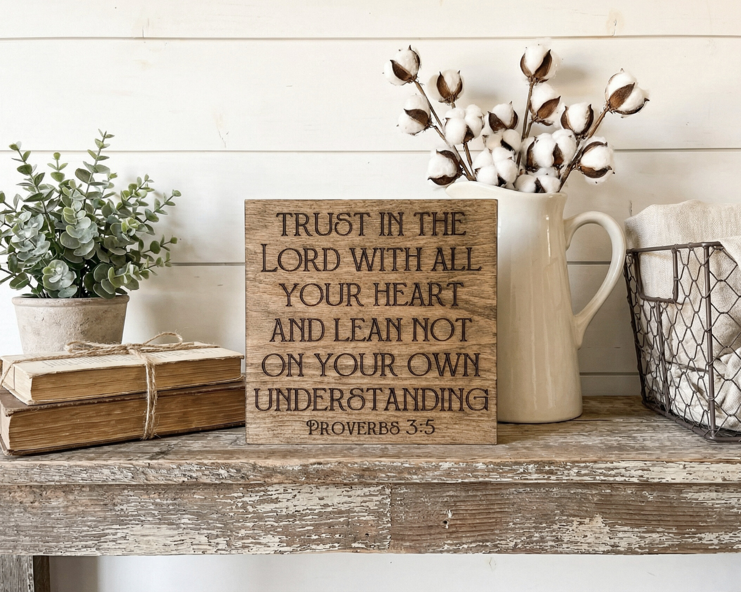 Bring timeless inspiration into your home with this handcrafted reclaimed wood sign, beautifully laser-engraved with the comforting words of Proverbs 3:5 - “Trust in the Lord with all your heart and lean not on your own understanding.” Each piece is made from authentic reclaimed wood, giving it a unique rustic character with natural variations in grain, tone, and texture. The deep, precise engraving ensures the verse is both elegant and enduring, making this sign a meaningful accent for any shelf, mantel, or desk. Perfect as a daily reminder of faith, a thoughtful gift for a loved one, or a charming addition to farmhouse, cottage, or rustic décor. Handmade in the USA with care, this piece is not only a beautiful decoration but also a heartfelt encouragement for everyday life.
