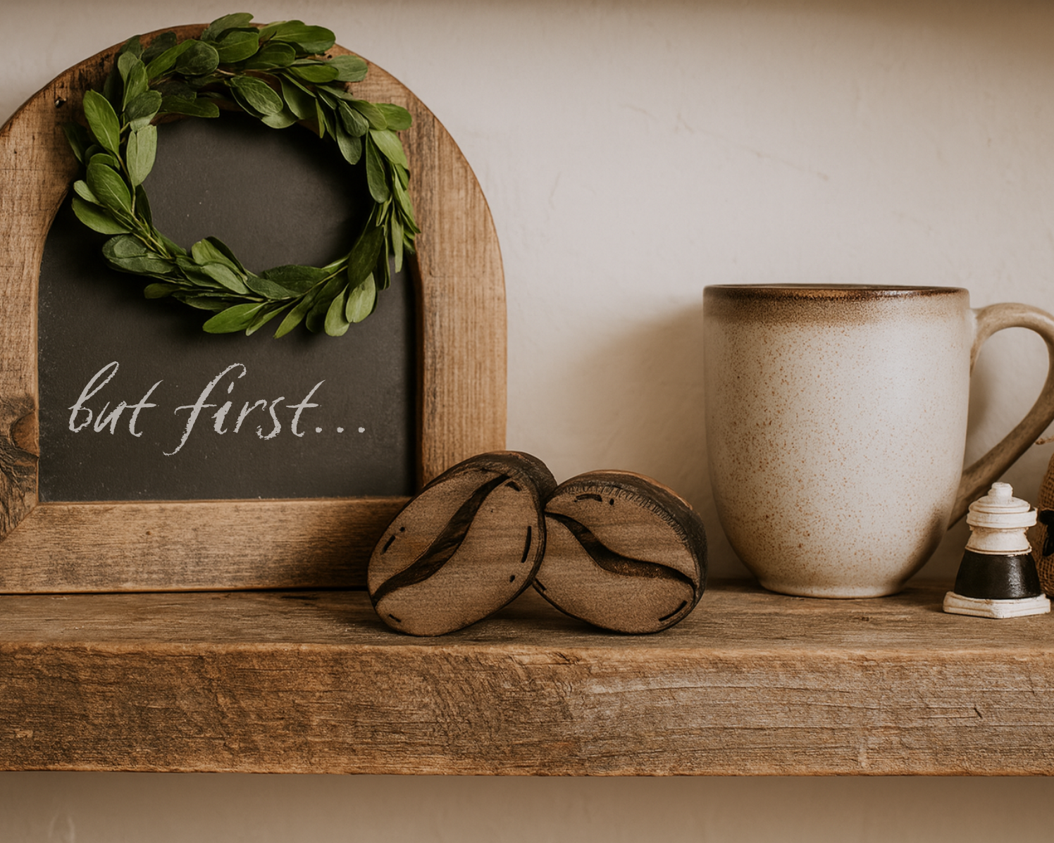 Bring the warmth of the coffeehouse into your home with these handcrafted reclaimed wood coffee beans. Made from solid reclaimed wood, each piece showcases unique weathered gray and brown tones, highlighting the natural character and rustic charm of the material. Measuring approximately 2 inches wide by 1 inch tall, these miniature wooden beans are the perfect accent for coffee bars, tiered trays, kitchen shelves, or farmhouse displays. Their engraved details give them a realistic, cozy feel while celebrating the beauty of salvaged wood. A simple yet distinctive touch for coffee lovers and rustic décor enthusiasts alike.