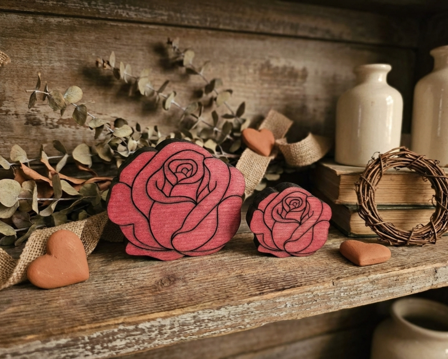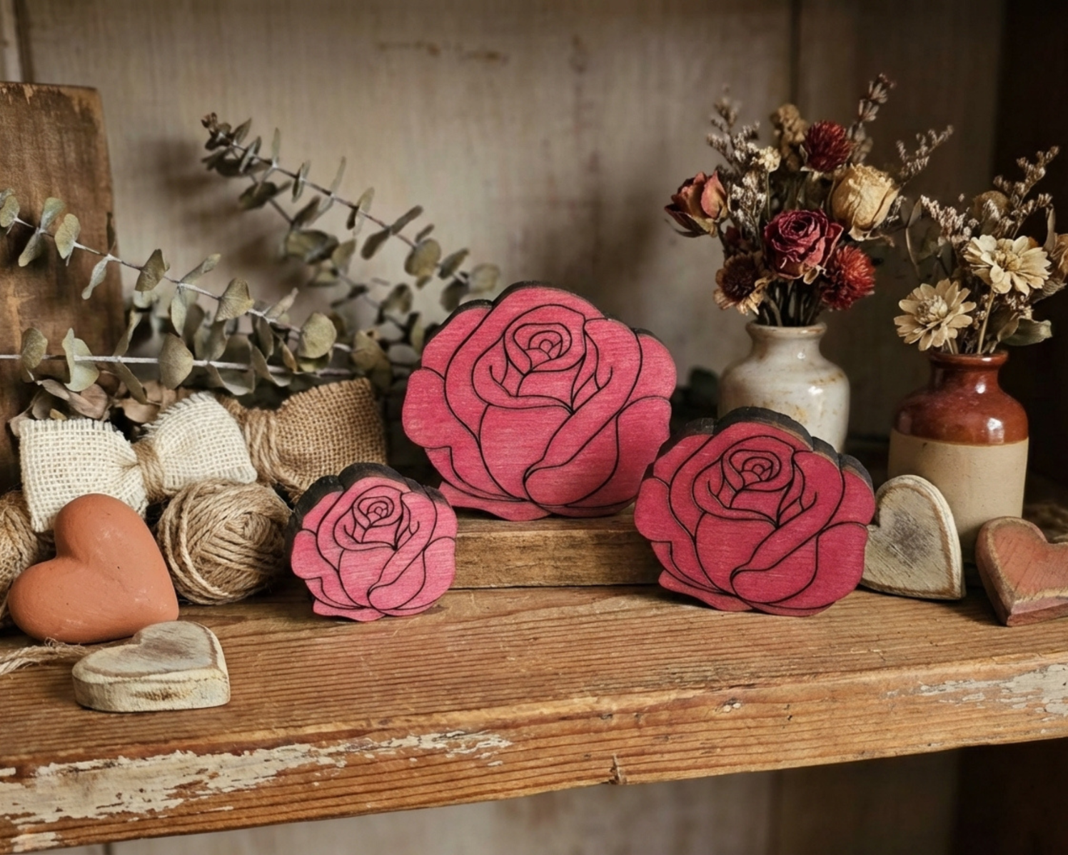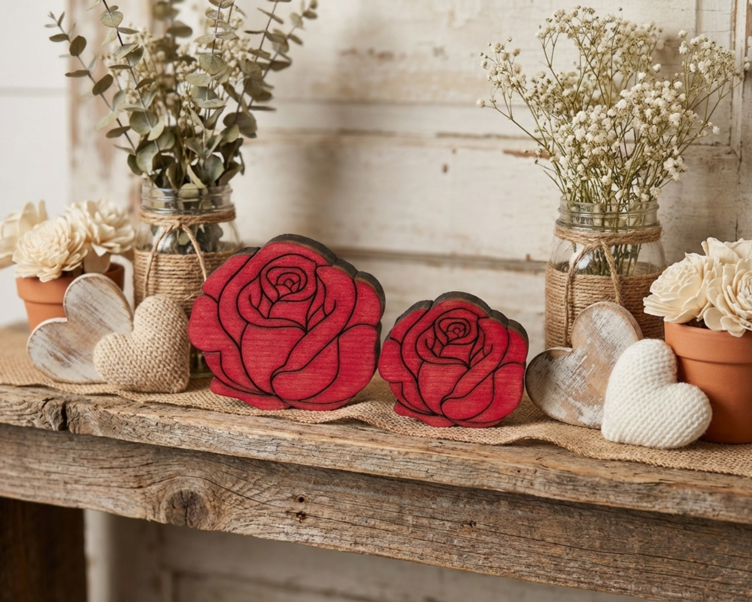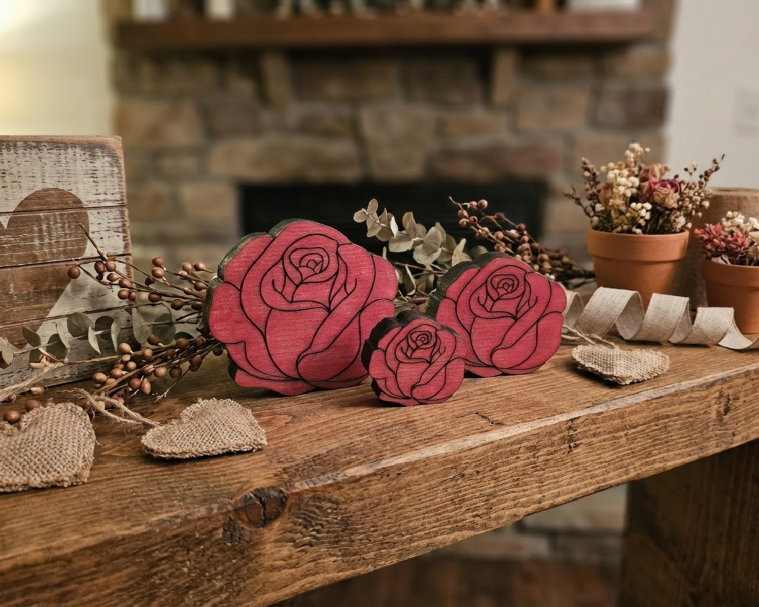These reclaimed wood roses bring a warm, rustic touch to Valentine’s Day décor and everyday farmhouse styling alike. Each rose is cut from solid reclaimed wood, carefully sanded smooth to the touch, and finished with burnt edges that highlight the character of the wood. No two pieces are exactly alike, wood tones range from faded red to deeper, richer hues, giving every rose its own one-of-a-kind look.
