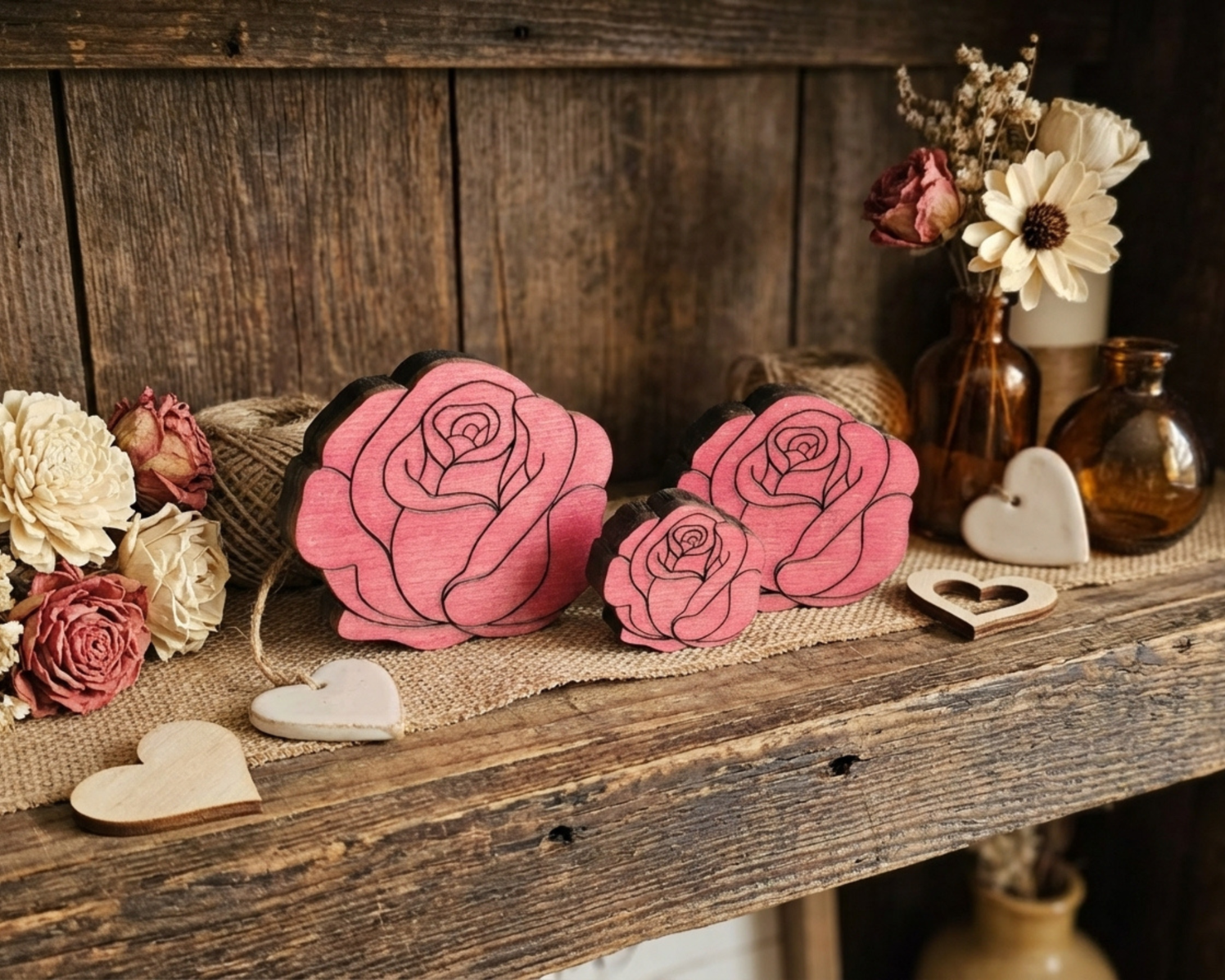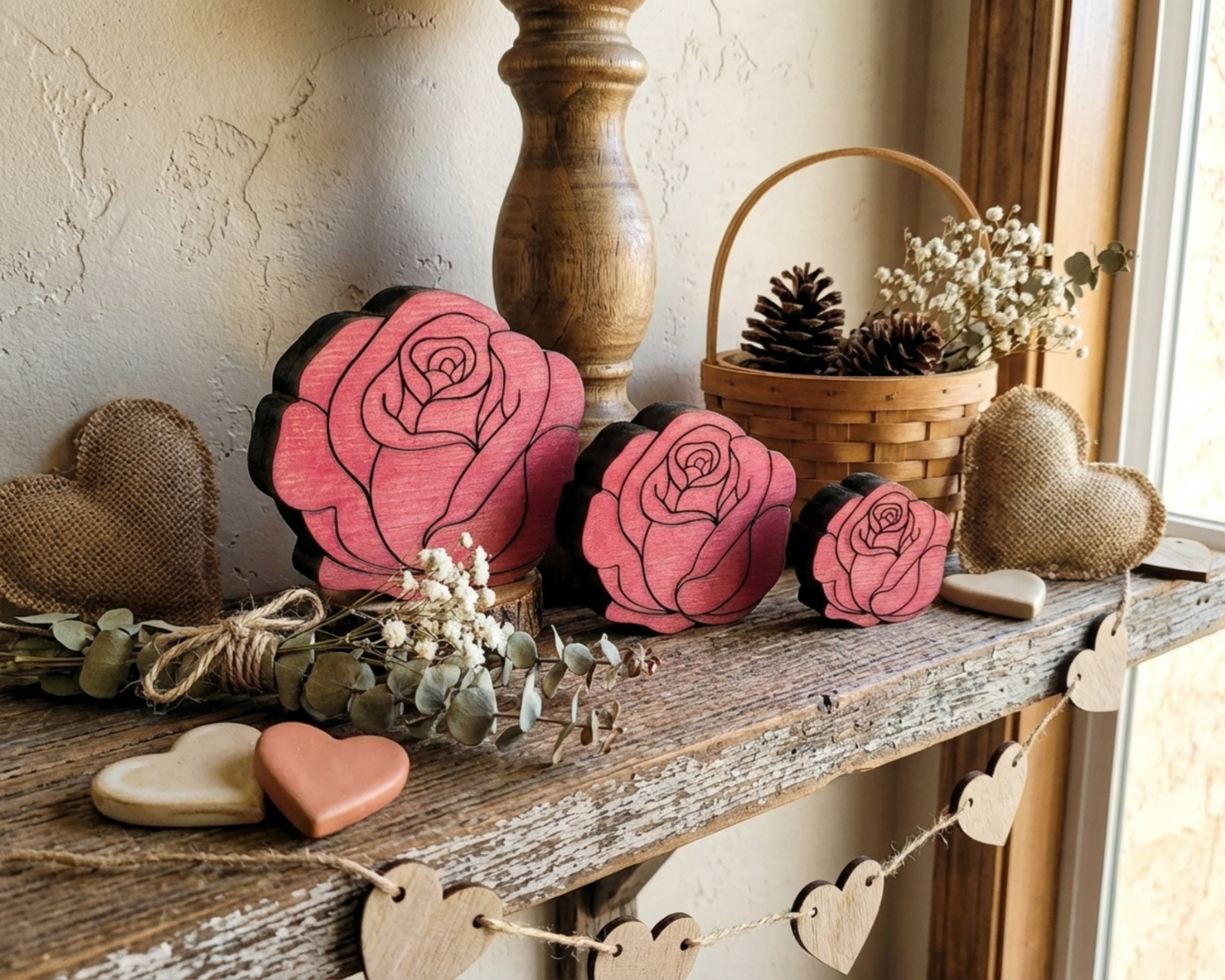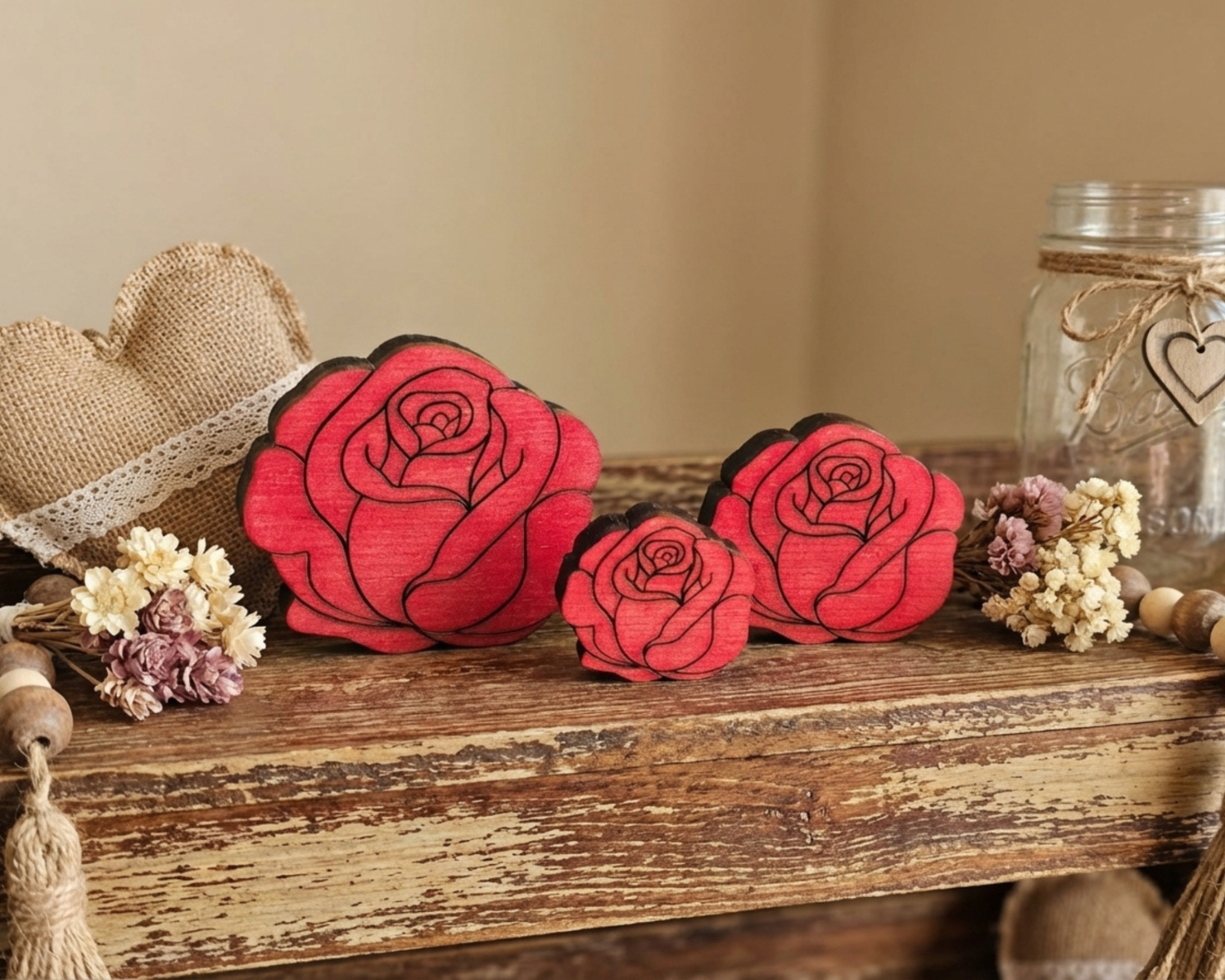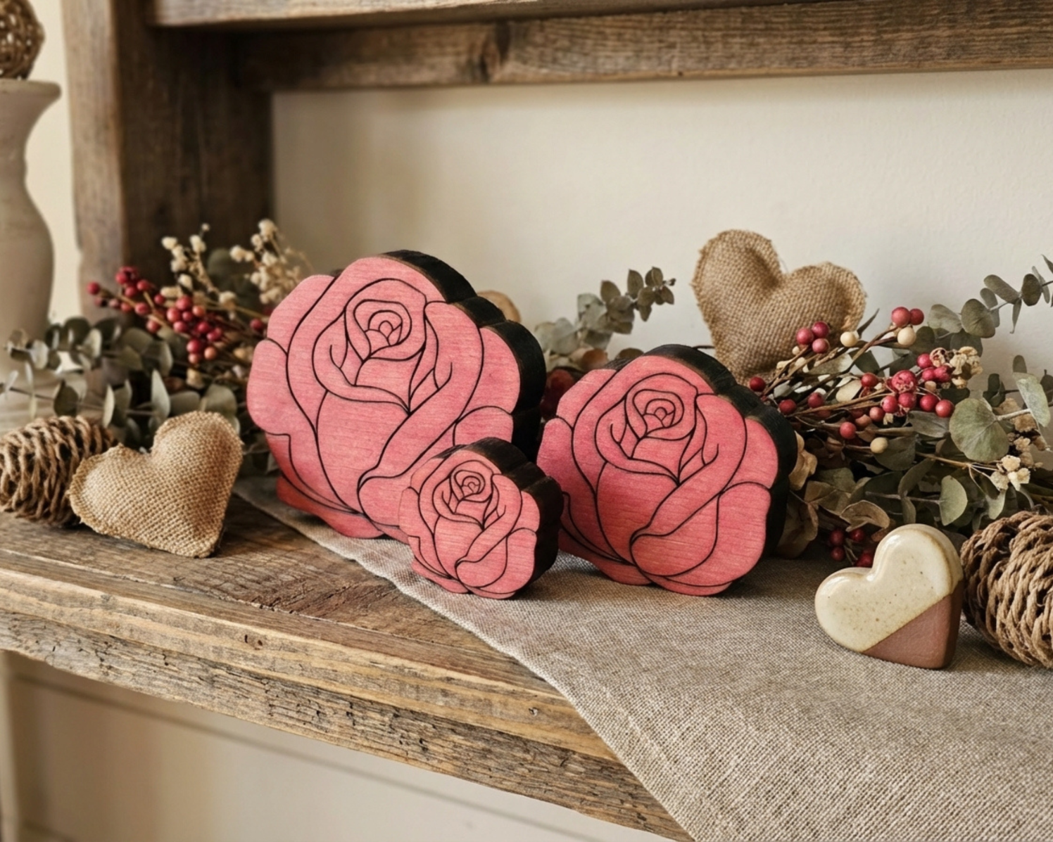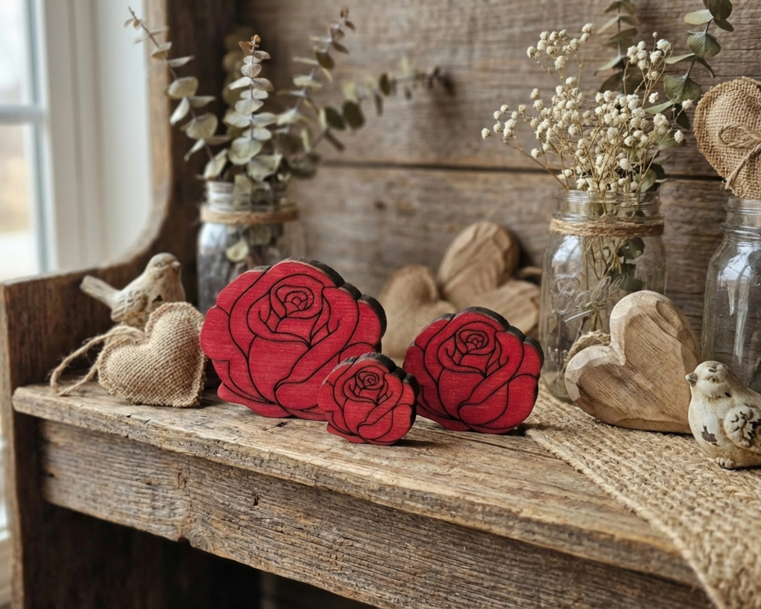 These reclaimed wood roses bring a warm, rustic touch to Valentine’s Day décor and everyday farmhouse styling alike. Each rose is cut from solid reclaimed wood, carefully sanded smooth to the touch, and finished with burnt edges that highlight the character of the wood. No two pieces are exactly alike, wood tones range from faded red to deeper, richer hues, giving every rose its own one-of-a-kind look.
