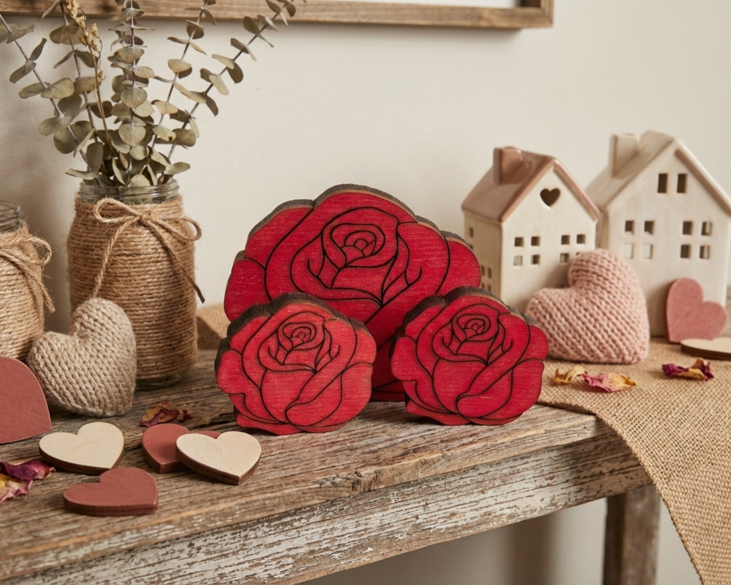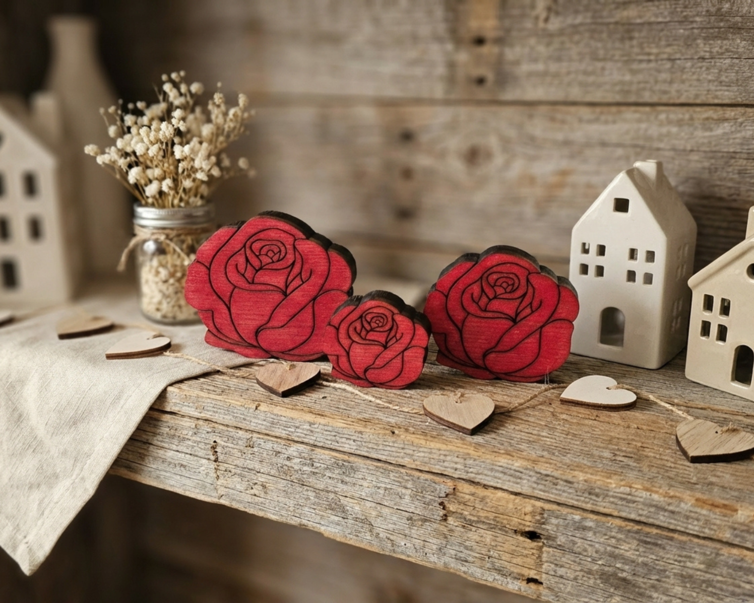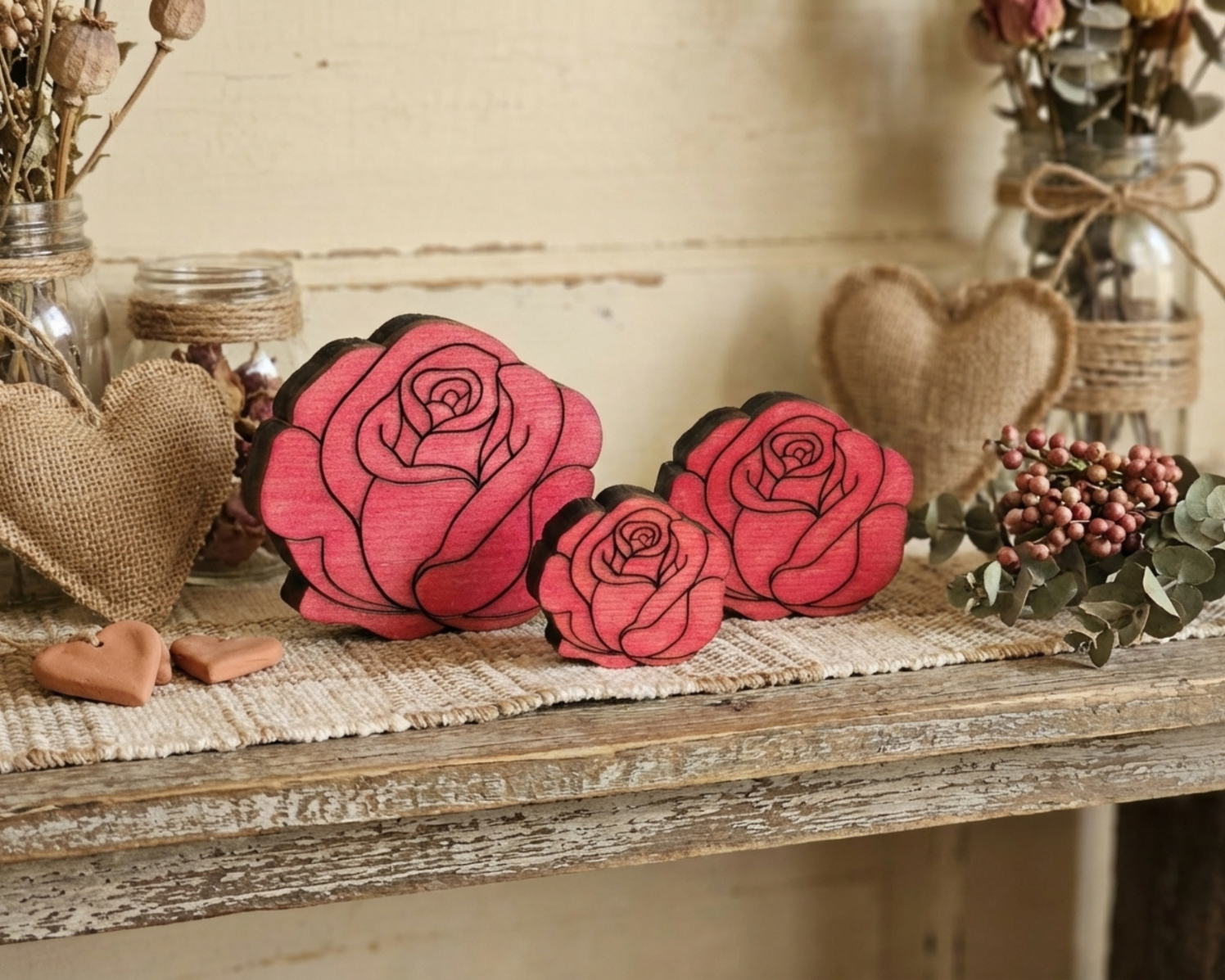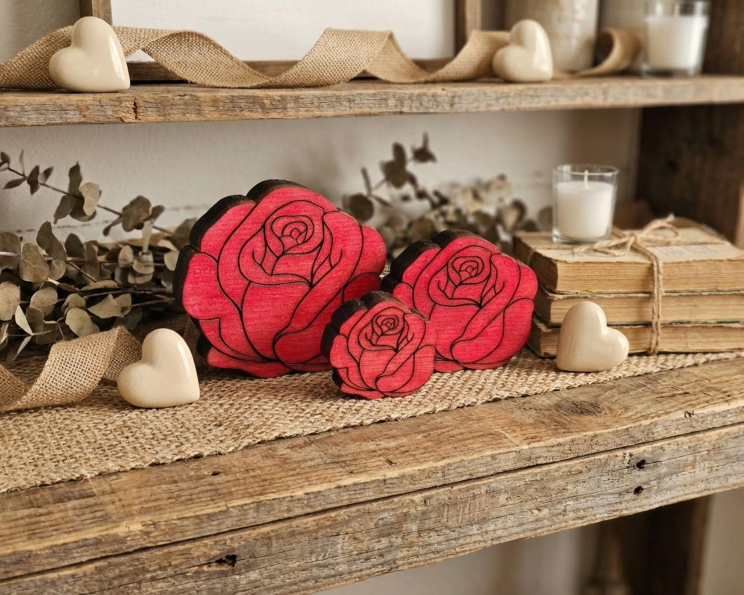 These reclaimed wood roses bring a warm, rustic touch to Valentine’s Day décor and everyday farmhouse styling alike. Each rose is cut from solid reclaimed wood, carefully sanded smooth to the touch, and finished with burnt edges that highlight the character of the wood. No two pieces are exactly alike, wood tones range from faded red to deeper, richer hues, giving every rose its own one-of-a-kind look.
