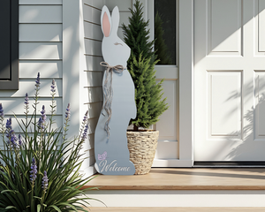 3D detailed wooden porch leaner standing gray rabbit with jut...