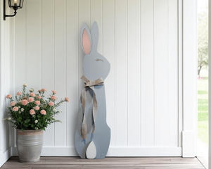 3D detailed wooden porch leaner standing gray rabbit with bur...