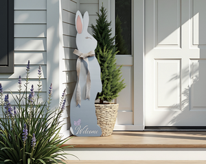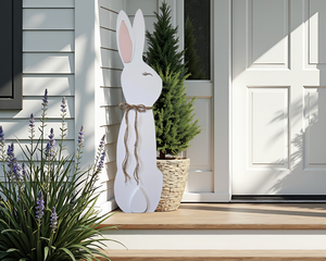 3D detailed wooden porch leaner sitting white rabbit with jut...