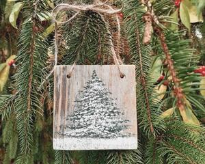 Hand-painted Christmas tree ornaments of snowy evergreen tree...