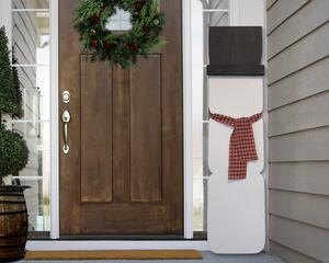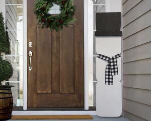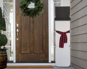 Wooden porch leaner Snowman with red & black plaid scarf.